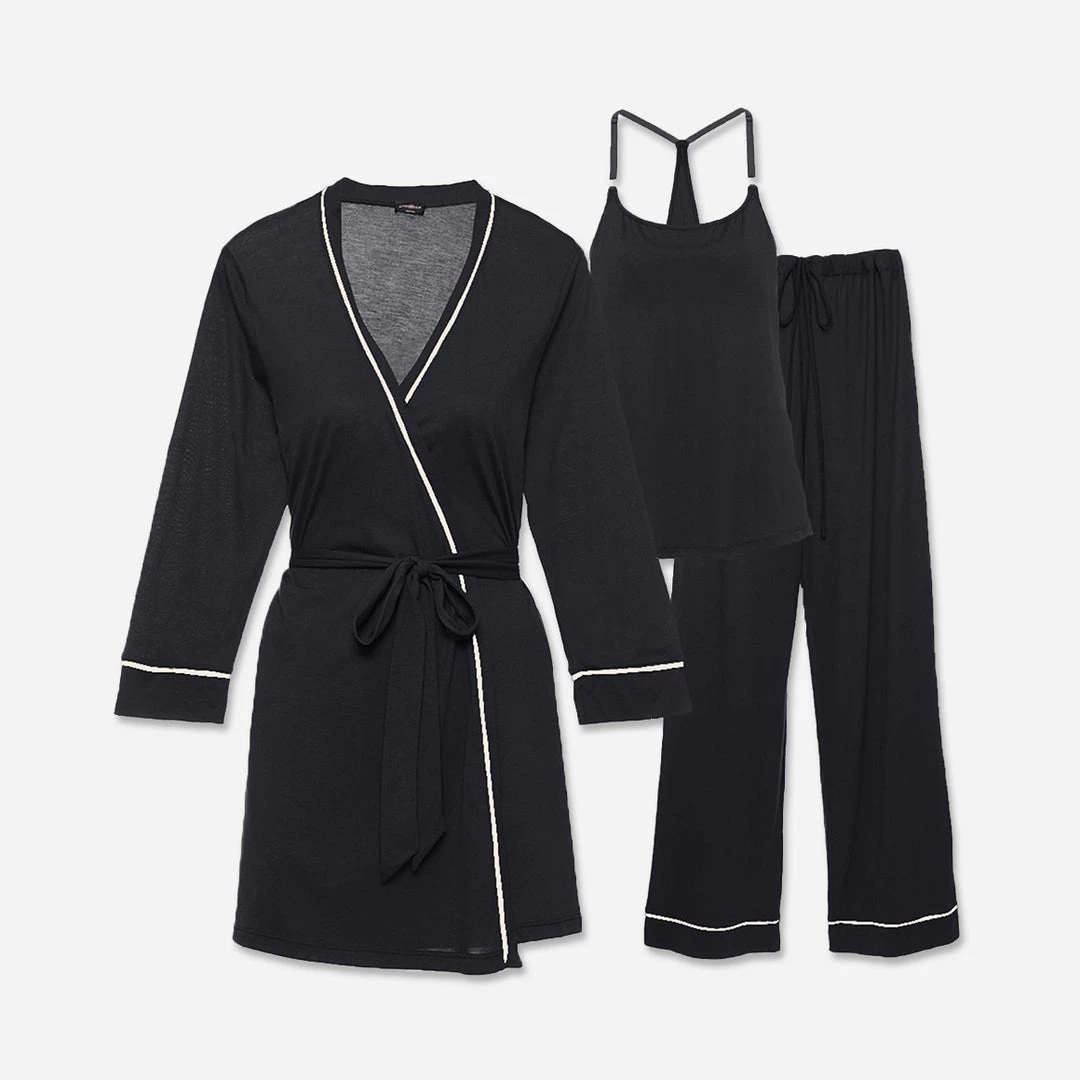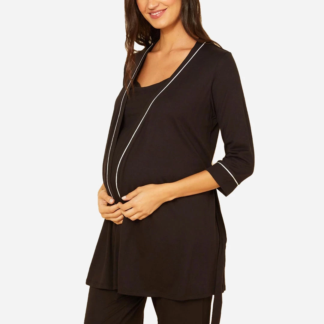 This open-front robe features a tie at the waist, and contrasting satin piping. The racerback nursing camisole features easy clip-on/clip-off nursing straps, and has slinged cups for a supportive fit with full coverage. The full length pants have a relaxed fit and a stretchy waistband. Made in Italy.