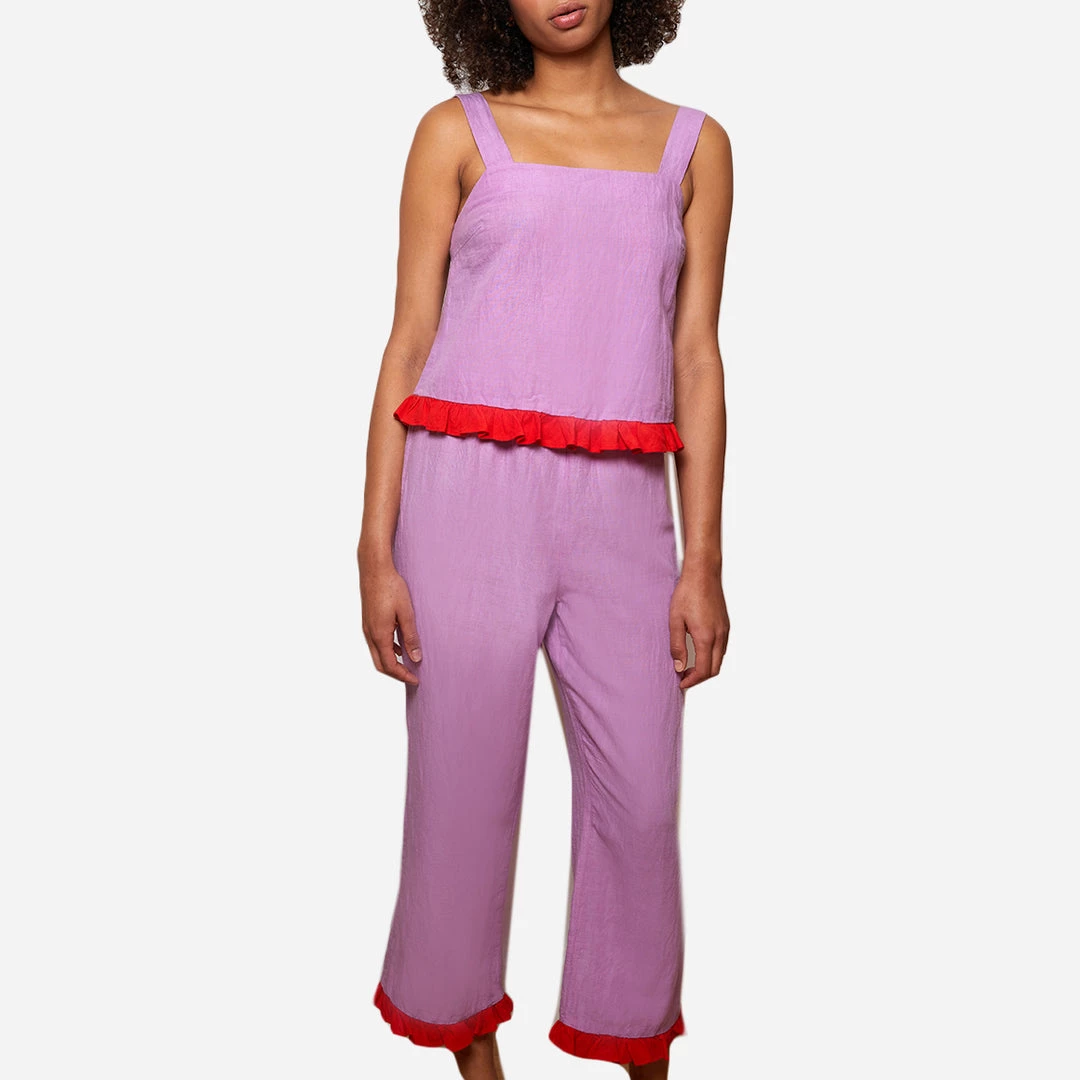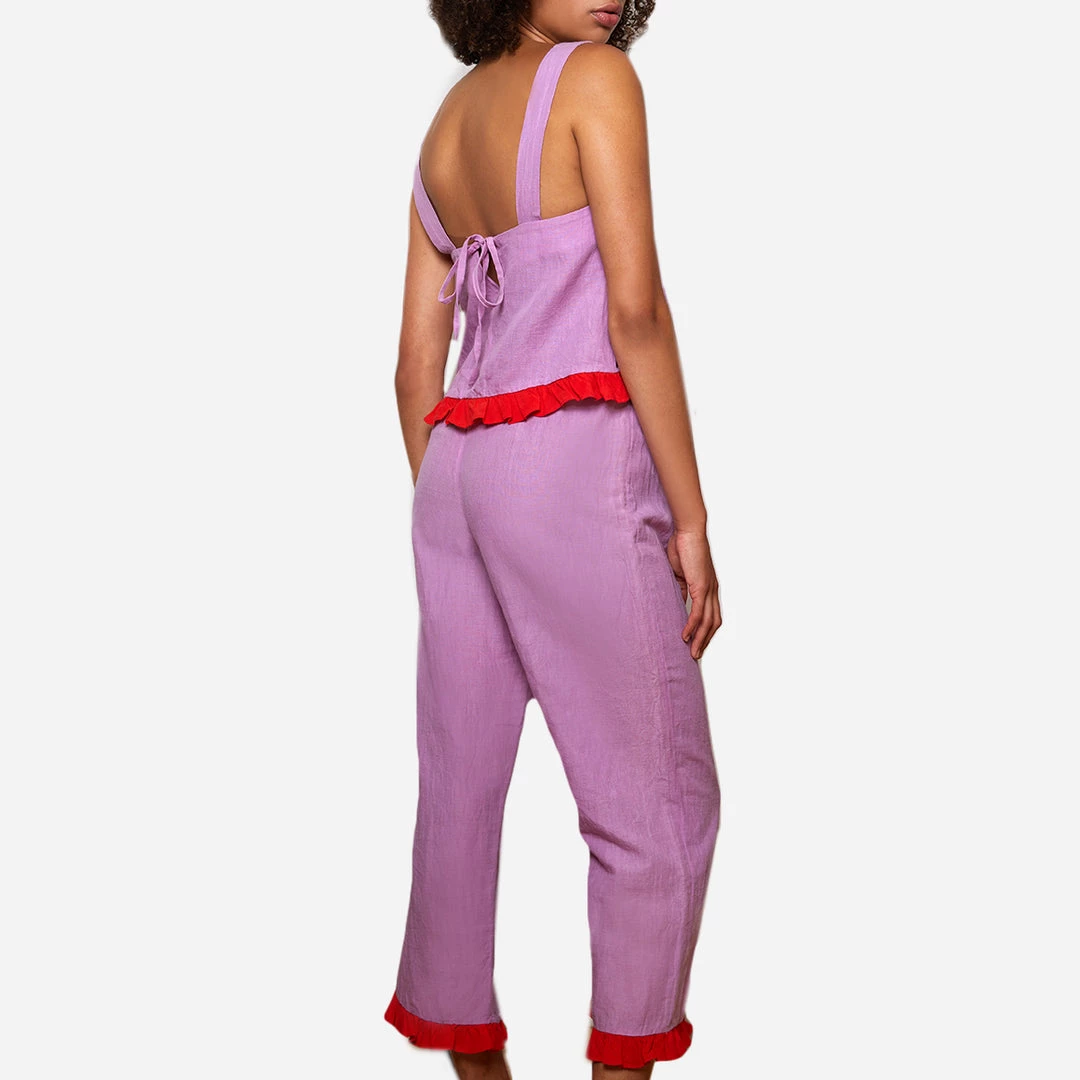 Cut from a linen and organic cotton-blend, this cami is super lightweight and breathable. An added red ruffle and tie back give it an extra feminine touch.