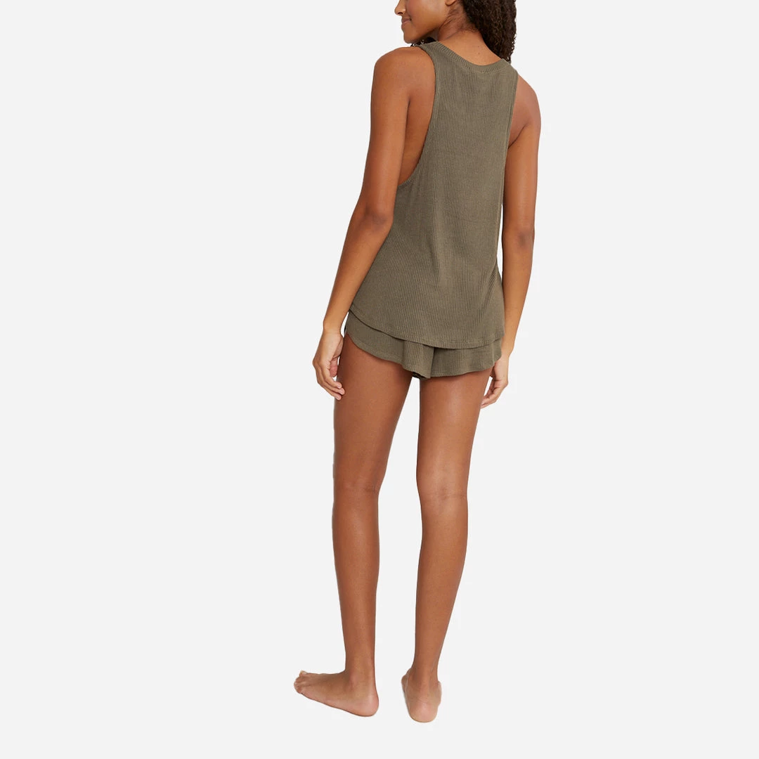 This finely ribbed, supremely soft, loose-fitting tank is a versatile piece perfect for sleeping, lounging, and brunching. The high-necked muscle tank top shows off a sexy shoulder and has a medium length. Pairs perfectly with shorts, cropped pants or leggings.