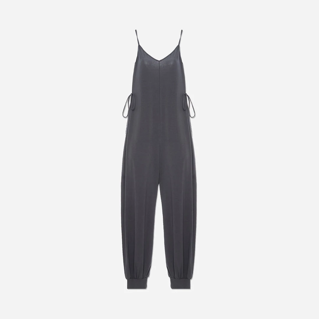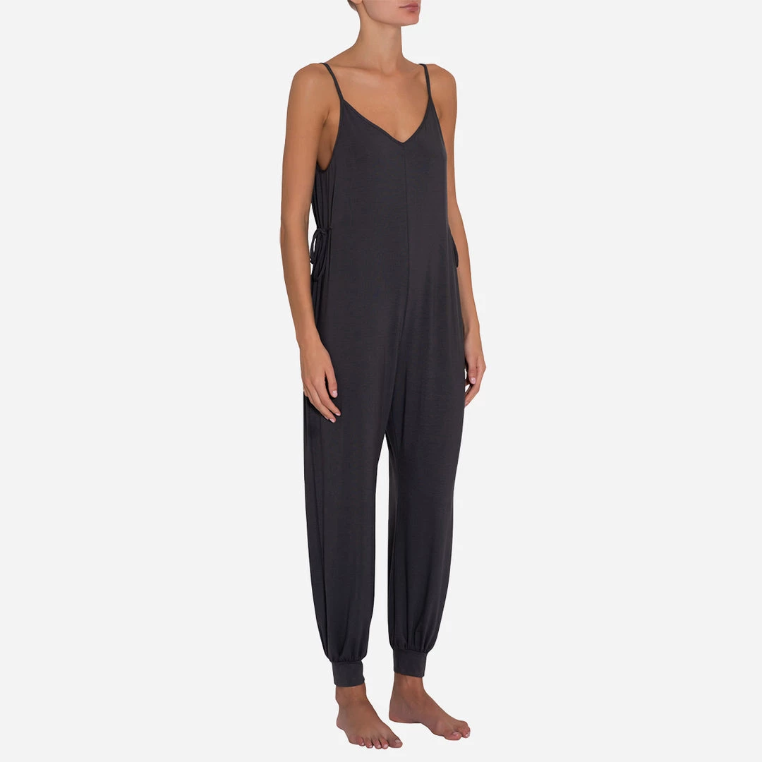 This comfortable v-neck jumpsuit gives your at-home look a stylish update. A relaxed shape that cinches at the waist with adjustable side ties and elastic ankle cuffs.