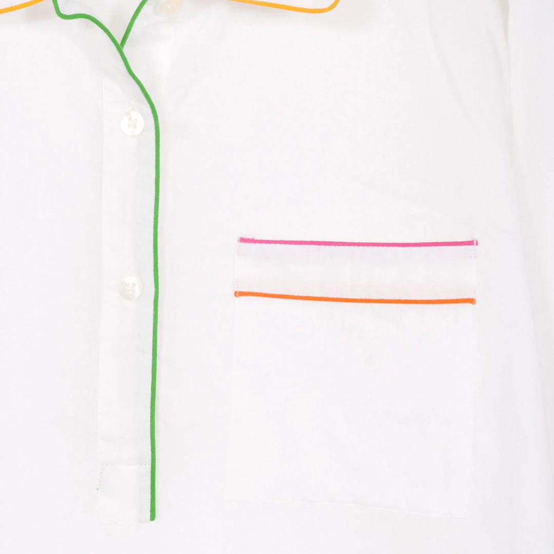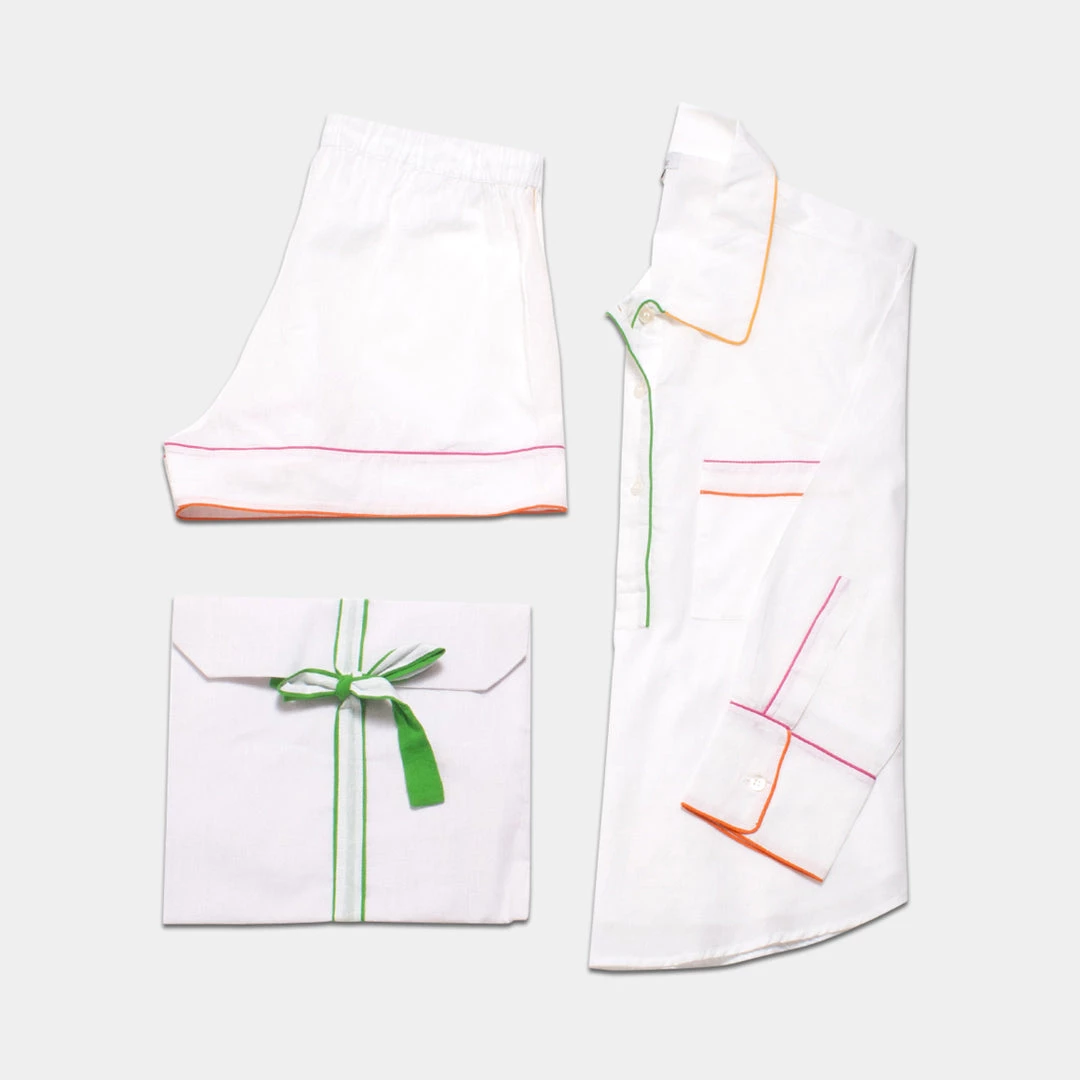 Handmade in India using ancient techniques and finished with rainbow piping, these pjs are the perfect addition to your summer holiday. Crafted from a lightweight and breathable cotton, this short set has a relaxed fit, side seam pockets and an elasticated drawstring waist.