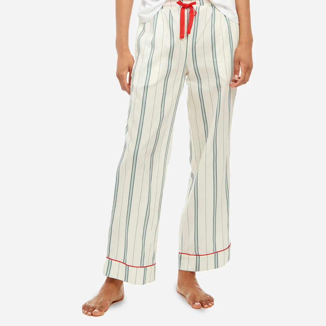 These cotton trousers have a slight flare at the bottom and a print that’s fit for wear in and out of the bedroom. They are finished with an adjustable red cotton tie at the waist and matching piping at the hem.