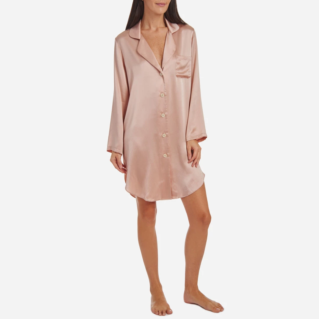 The Jillian Night Shirt is made from a luxe silk charmeuse. The slim and flattering fit features high, side slits. Wear this to bed, or pair it with a pair of skinny jeans for a day out.