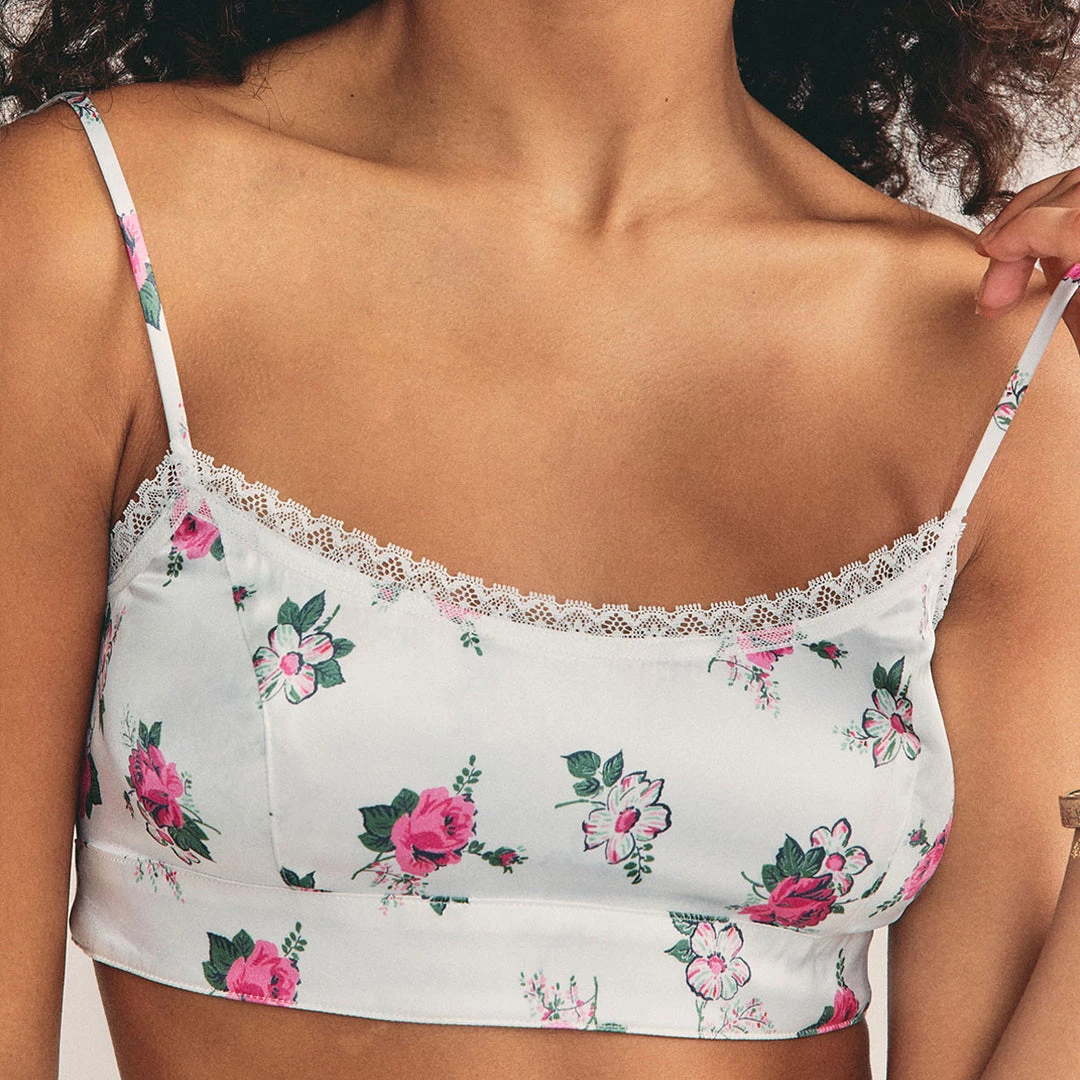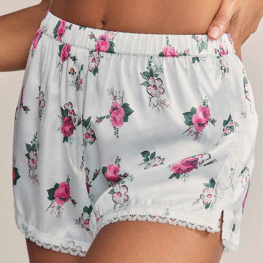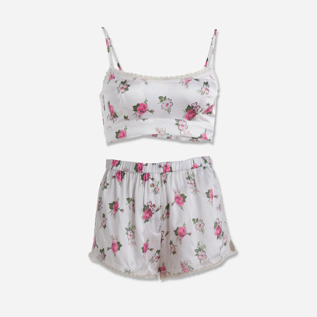 Introducing Morgan Lane’s gorgeous collaboration with Love Shack Fancy! The Noelle Martine Set is made from a luxe silk viscose printed with an iconic Love Shack Fancy floral. The set is trimmed with a beautiful white lace, making it perfect for the ultimate bridal look. The bra top has a comfortable shape with elastic smocking at the back. The shorts are cut like a girl’s boxer short. Style together or separately, or purchase for your bride to be!