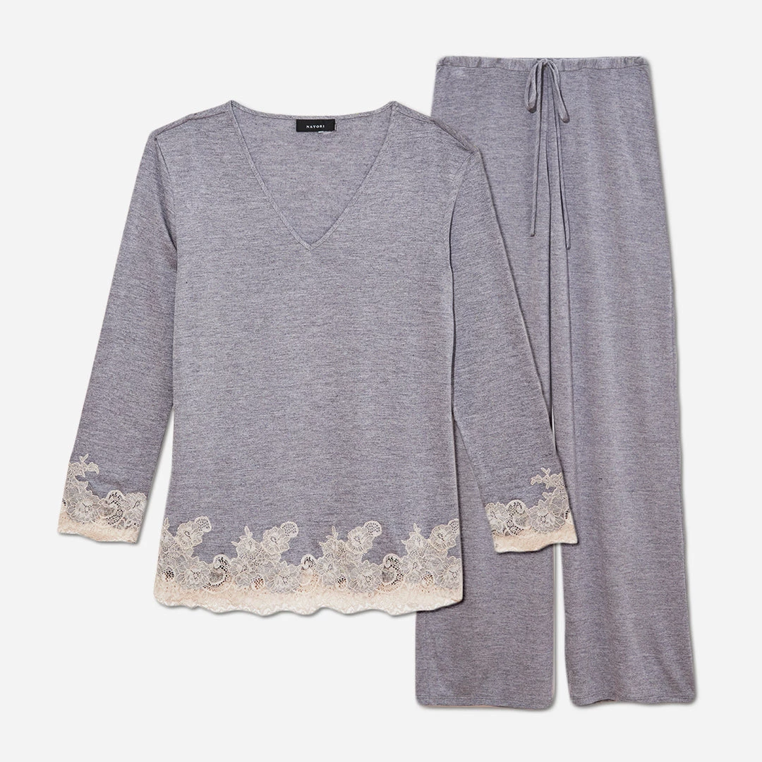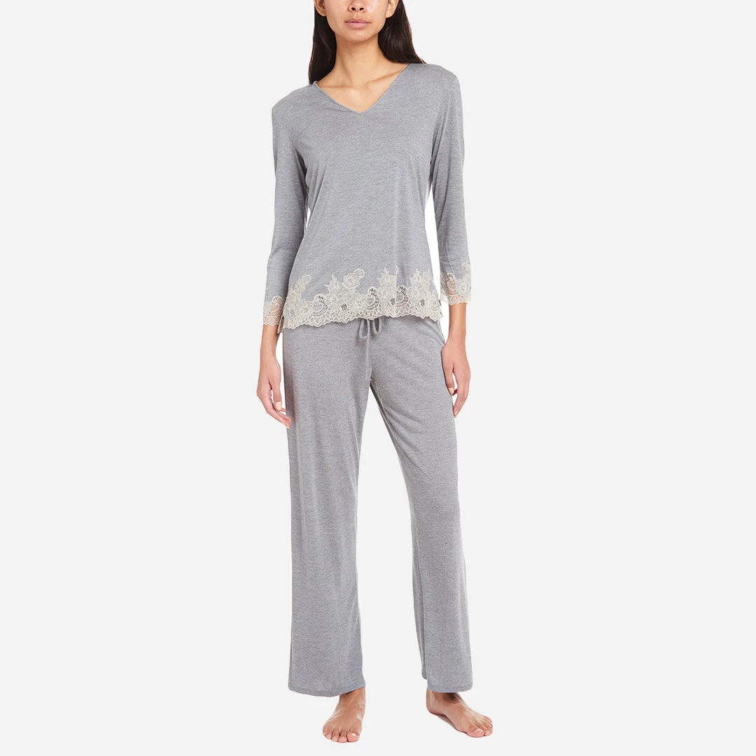 Bring a touch of sophistication to the bedroom with this luxe pajama set in heather grey. Crafted from a lightweight blended jersey modal, the feel is soft and cool on the skin. Finished with a delicate lace trim at the hem and flattering v-neckline.