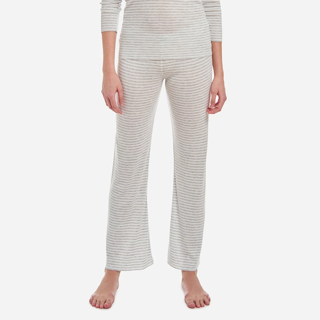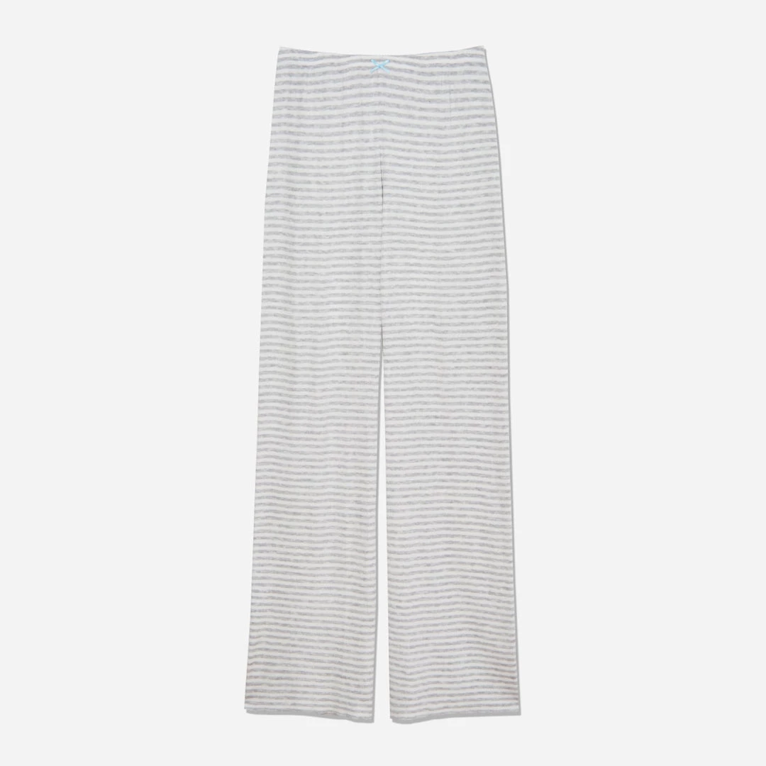 Lounge luxuriously in this super soft pant in a timeless sailor stripe. This solid knit pant has an elastic waistline and is trimmed with cream lace hems and a cream satin bow.Â