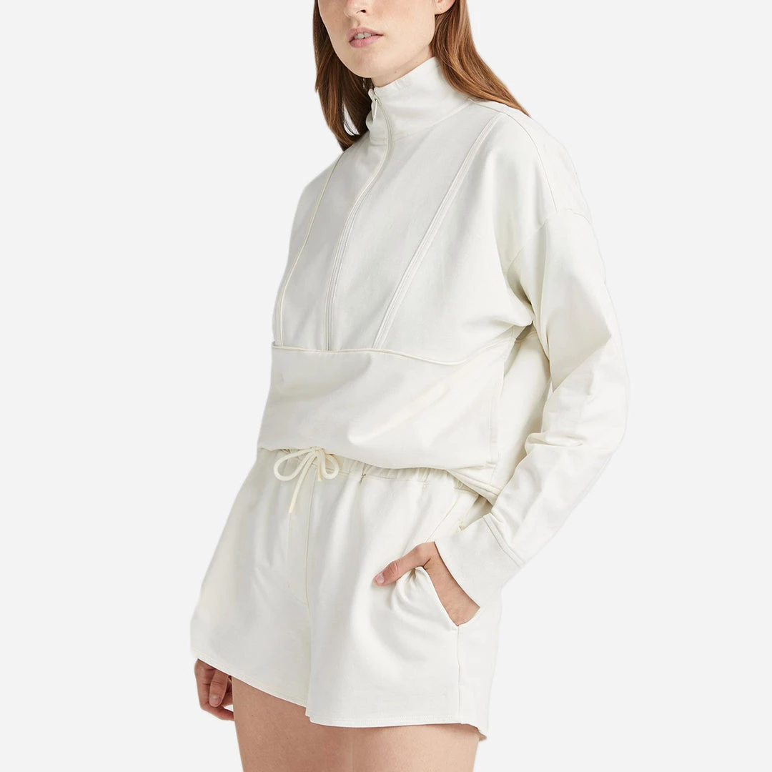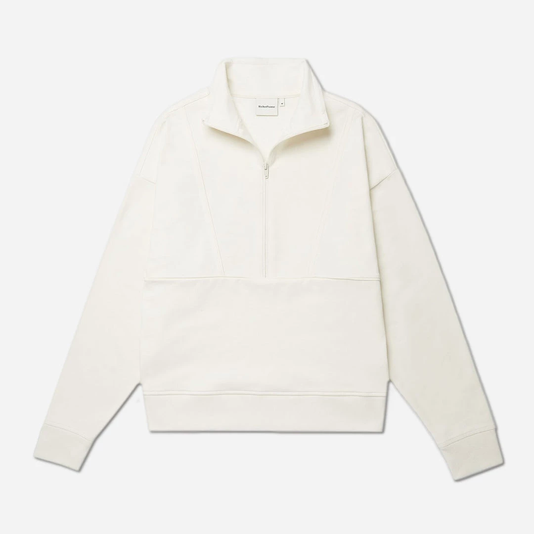 This terry half-zip pullover has a unique stretch. The fabric is drapey, lightweight, and moisture-wicking. The fit is relaxed and rounded through the body, with a ribbed hem for a modern shape. Additional features include dropped shoulder seams, a versatile mock neck half-zip, piping-detailed chest seams, and a discrete side-seam kangaroo pocket.