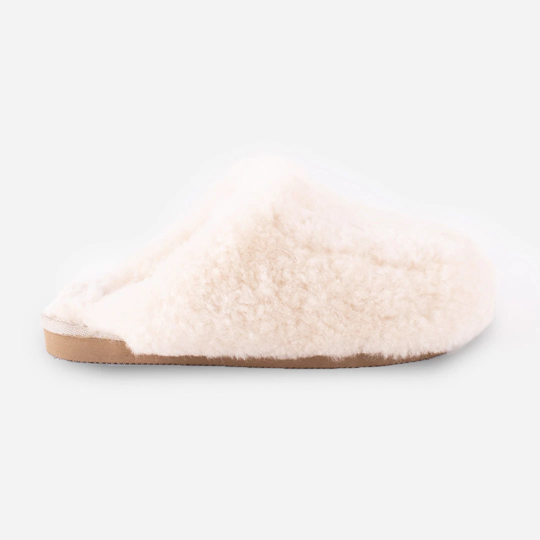 Slip into comfort. This cream colored sheepskin slipper has a soft shearling outer and lining for plush warmth. A rubber sole permits both indoor and outdoor use.