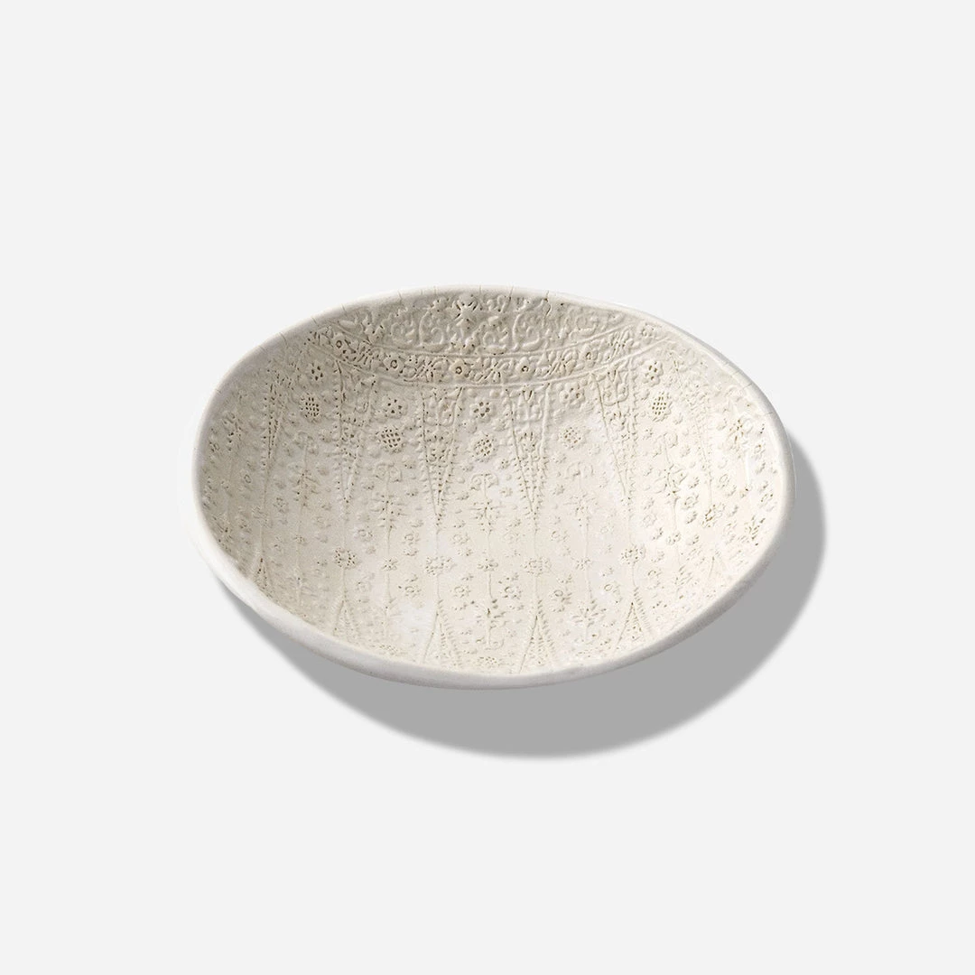Skeem Design’s beautifully embossed stoneware bowl is hand-made by ceramic artist Ellen Hammen. It is perfect for holding a stick of burning Palo Santo, as a bedside ring bowl, or for your kitchen table.