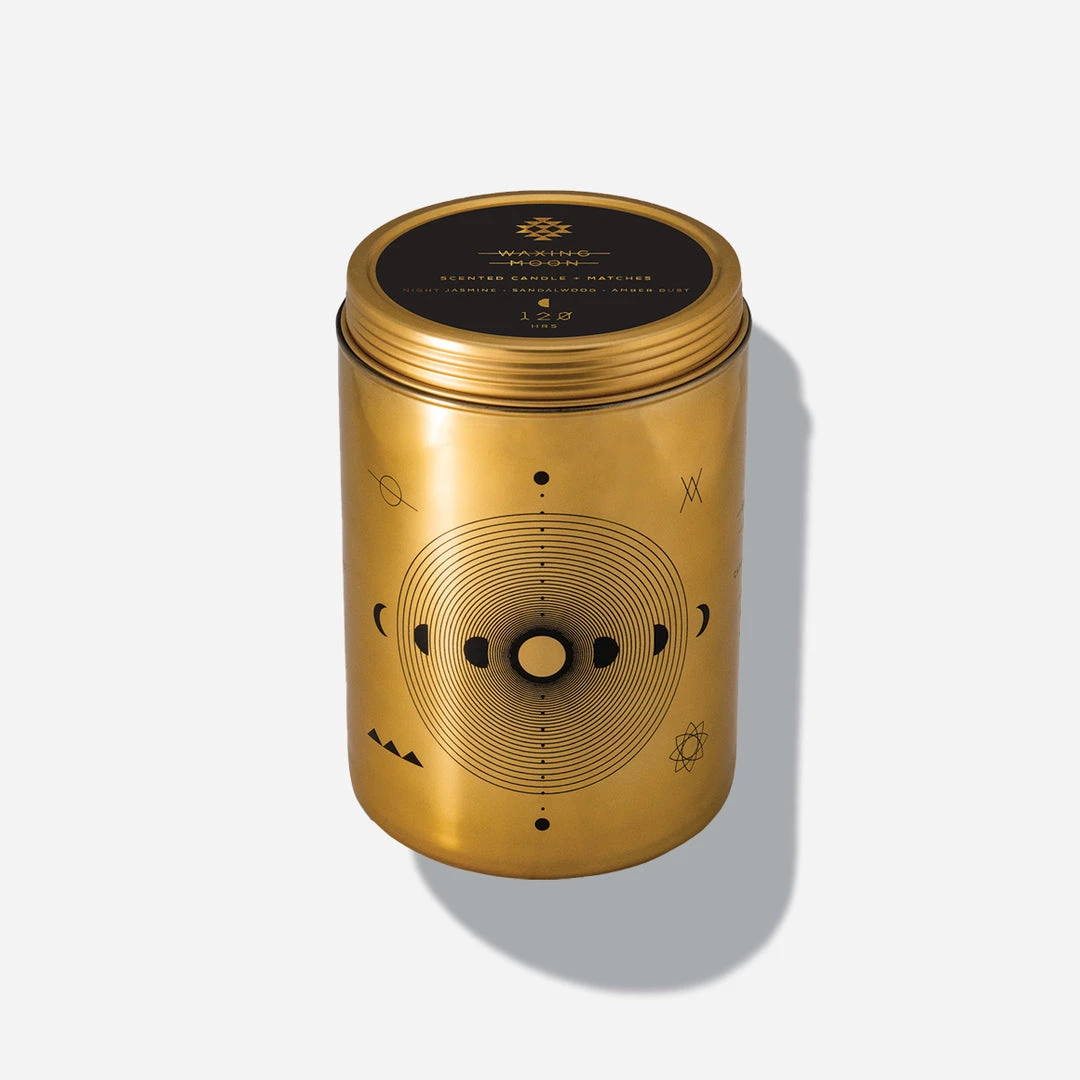 This totem candle is designed with a lid that is a tin filled with matches. With a striker placed on the bottom, you have everything you need to spark a flame. The waxing moon candle has a heady floral jasmine scent deepened with woodsy sandalwood and amber notes.
