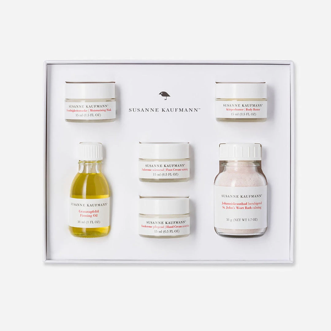 The box includes: St. John’s Wort Bath Calming (60 g), Moisturizing Mask (15 ml), Foot Cream Warming (15 ml), Hand Cream Nourishing (15 ml), Body Butter (15 ml), Resculpting Oil (30 ml).