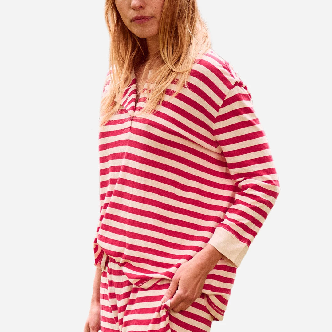 The Sleep Henley reminds of old school base layers with a touch of holiday cheer. This vintage-inspired design has a boxy, cropped fit with three-quarter length sleeves and a ribbed collar and cuff.