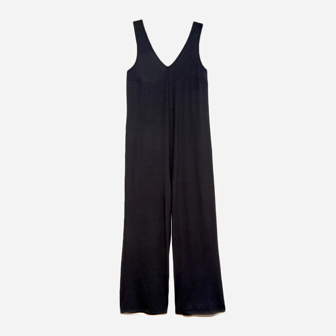 This black jumpsuit is the ultimate addition to your loungewear wardrobe, whether staying in or running out. Features include a sleeveless v-neckline and back and wide leg, cropped pant. Step in to this style with ease for chic comfort.